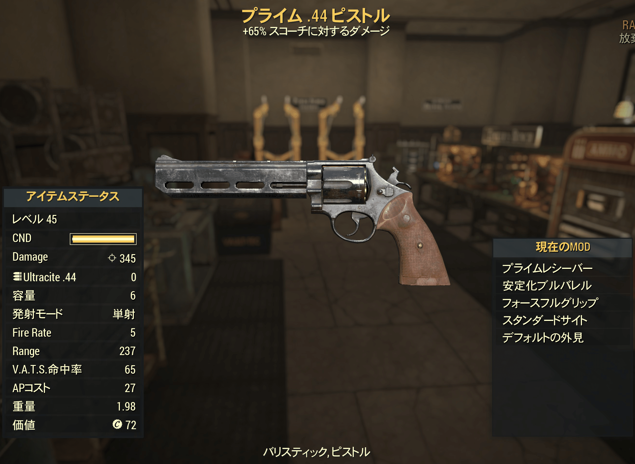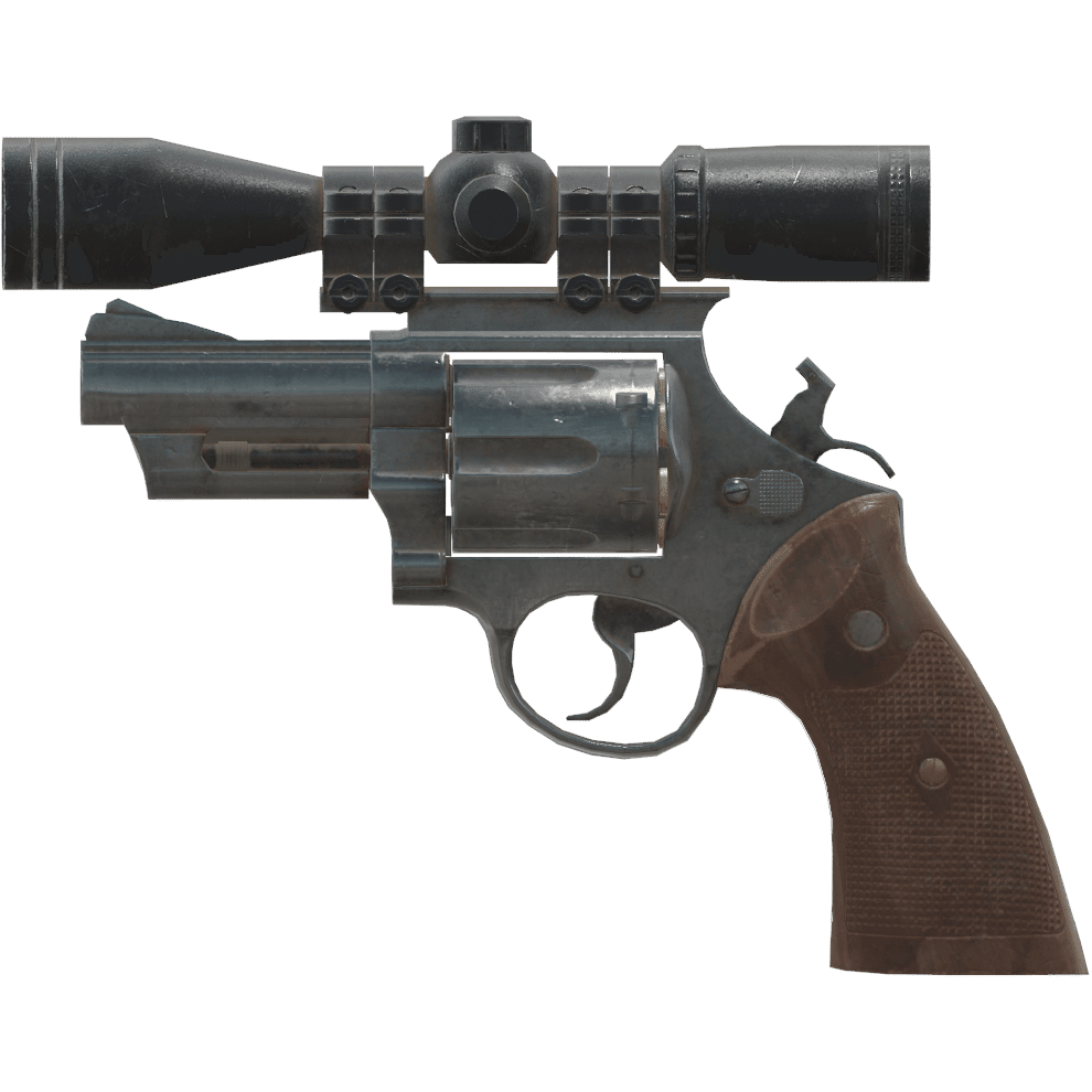 .44ピストルは、.44マグナム弾薬を使用するダブルアクションのリボルバーで、標準的な木製グリップを備えています。