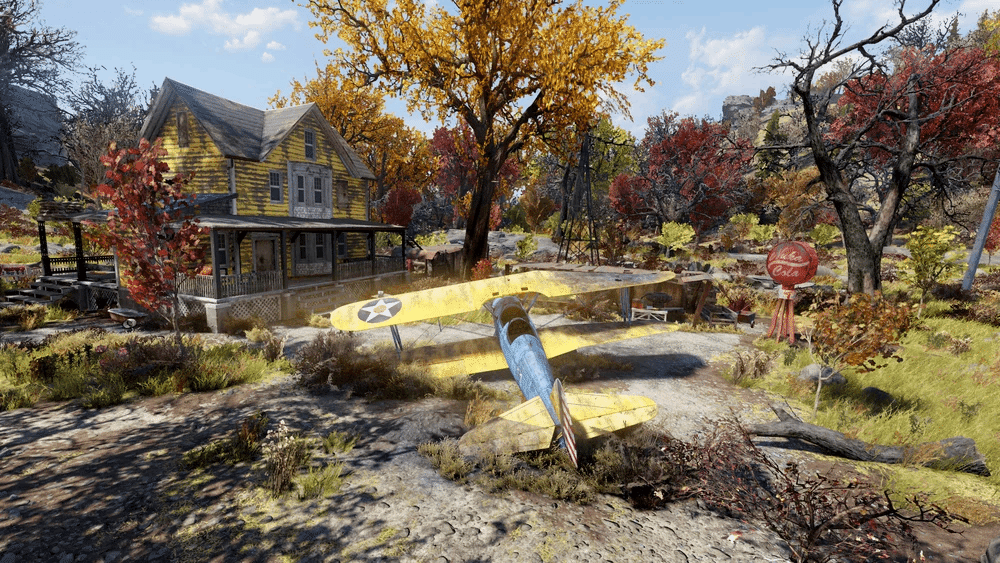 農場の反対側には、損傷した青と黄色の複葉機が家の近くに設置されており、その隣には簡易修理工場があり、化学ステーション、調理ステーション、細工作業台、武器作業台が備え付けられています。