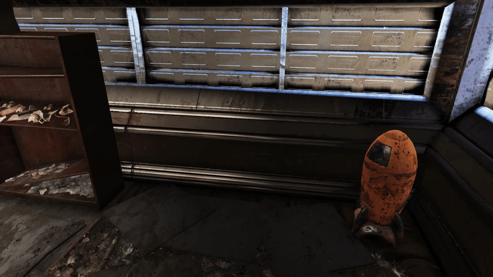 端末(ハッカー1)でロックされたドアが、ファーストエイド 、ロックされた爆発物クレート (ピックロック1)、弾薬箱 がある物置へ続きます。