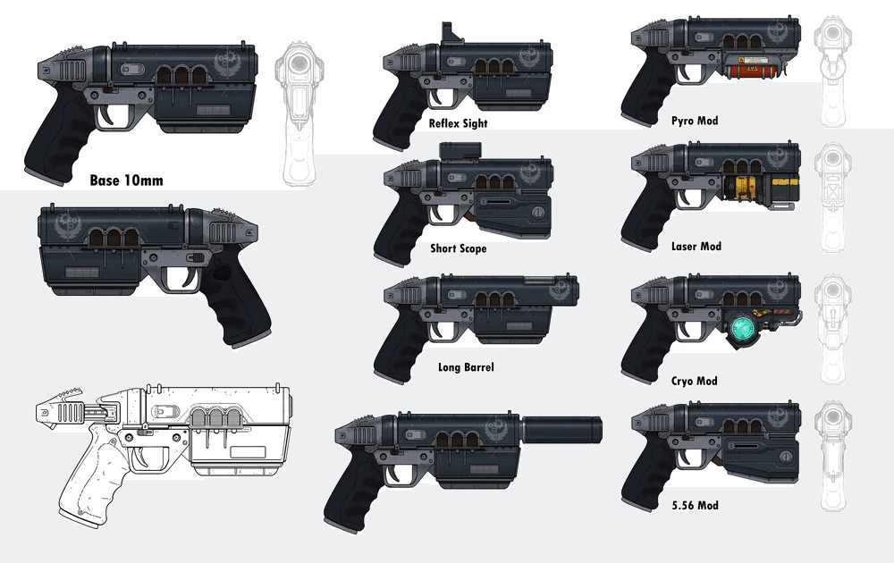 デザインは、Fallout: New Vegasに登場した「12.7mmピストル」や、現実世界のデザートイーグルを彷彿とさせます。