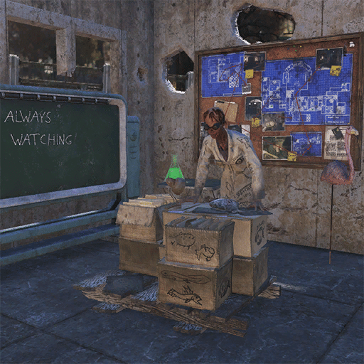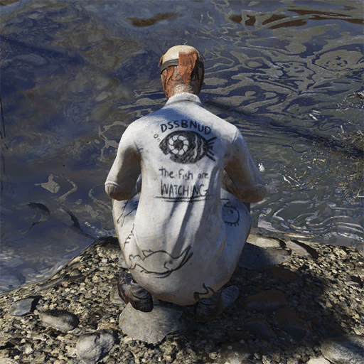 このキャラクターはベンダーであり、ジャンクアイテム、衣装、武器、ハープーンガン、各種雑誌(US Covert Operations Manual 5, CAPS ARE CAP-ITALISM?, TOYING WITH US!)を販売します。
