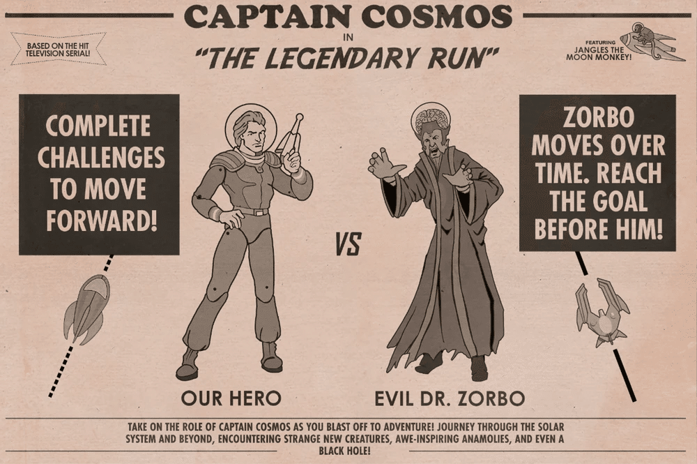 彼は最初にボードゲーム『The Legendary Run』において、キャプテン・コスモスやムーンモンキーのジャングルズと共に登場しました。