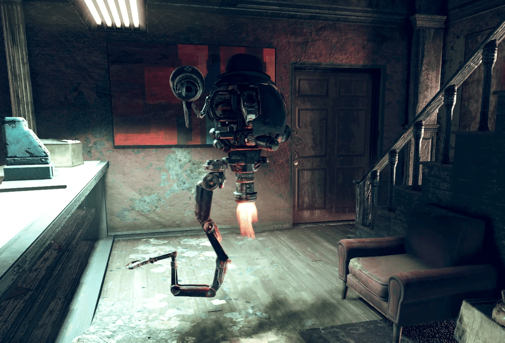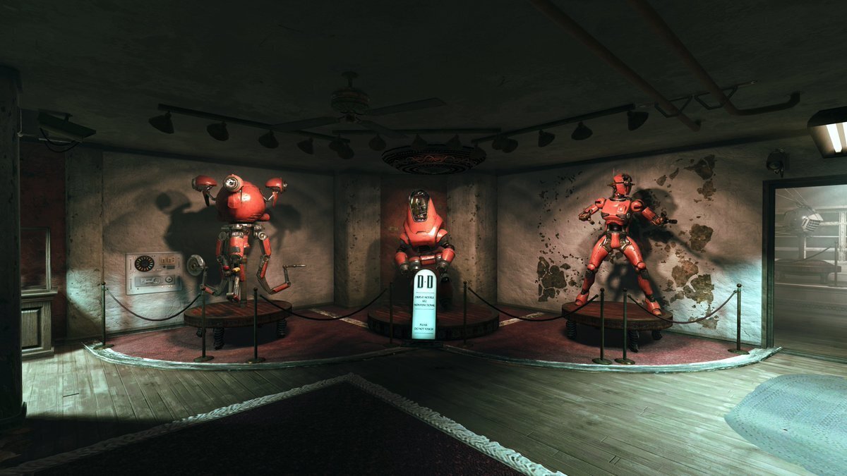 スキナーの背後にある階段を上がるとミスター・ハンディ・ショールームの扉があり、その中にはアサルトロン・ショールームへの扉があります。