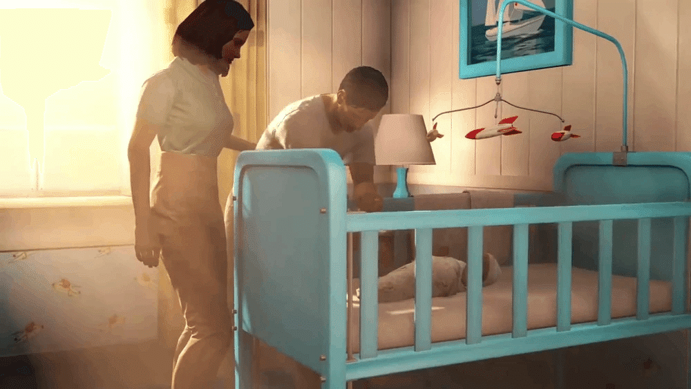 代表者が去った後、ショーンが泣き、その親は彼を落ち着かせるためにベビーベッドの上でモビールを回します。