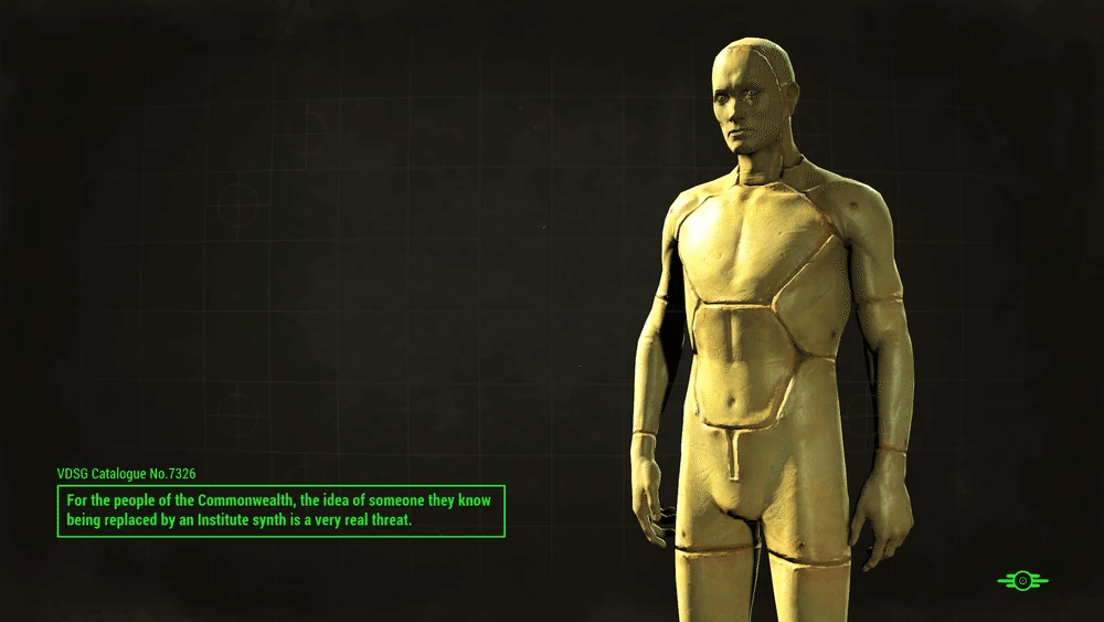 インスティチュートは、Synth(人造人間、シンセ)として知られる人工的な人間そっくりの存在に取って代わられるかもしれないというパラノイアをコモンウェルスの人々に植え付けています。