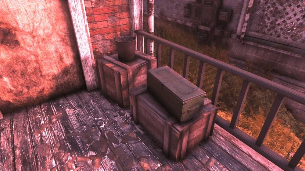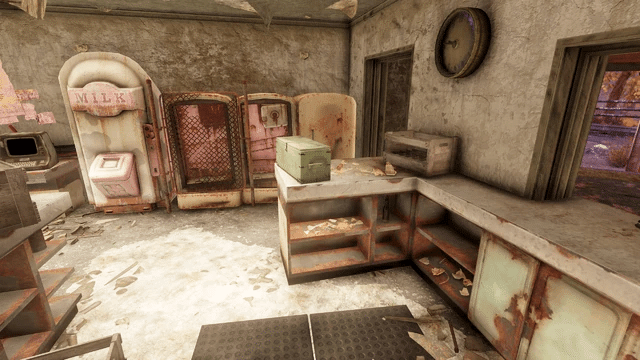 酒場は2階建てで、隣接する駐車場には大きな調理スペースが設けられています。1階の北東の壁沿いには自動訓練キオスクが設置されており、Vault居住者はここでレスポンダーのボランティアに登録することができます。