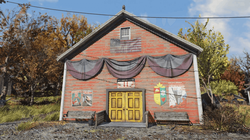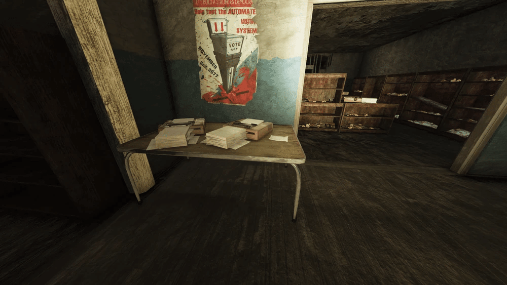 内部にはメインホールがあり、いくつかの投票ブース、暖炉、そして小さなバックオフィスがあります。