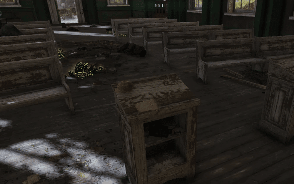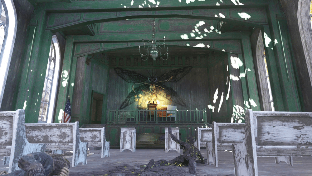 スコーチが通りを徘徊しているのが見られる一方で、モスマン教団はかつて町の教会を神殿として使用しており、内部にモスマンの像を残していきました。