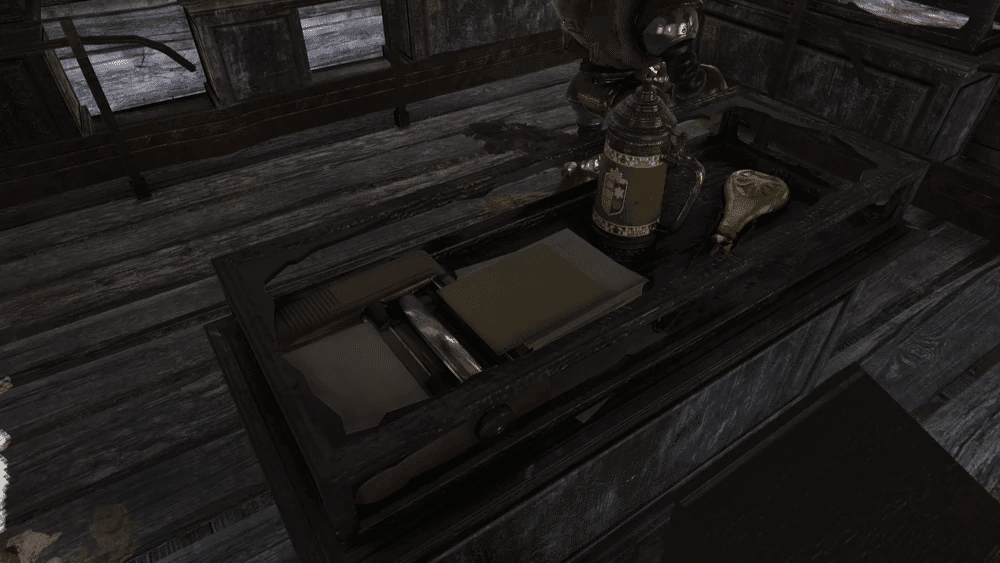 事務所の机の上にあります。郵便局へは、施錠された正面玄関から入るか、建物に登って入ることができます。郵便局の鍵のかかった部屋を開けることができます。