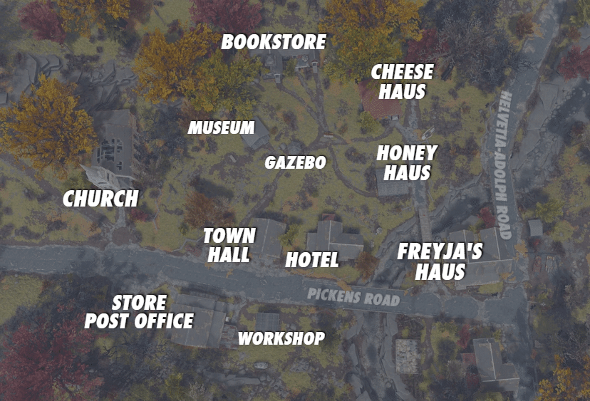 アパラチアの探索中にヘルヴェティアを訪れると、他の荒廃した場所とは異なる「温かみのある奇妙さ」を感じるのは、実在する村の強い個性が反映されているからだと言えます。