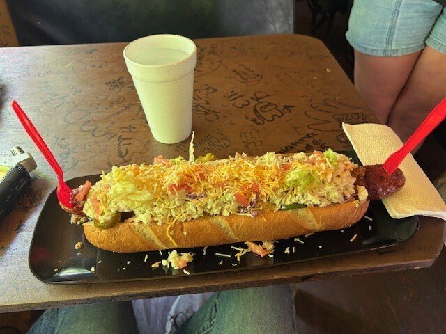 1ポンドのソーセージに、炒めたピーマン、タマネギ、2種類のチーズ、レタス、トマト、ハラペーニョ、特製ソース、マスタード、ケチャップ、コールスローがどっさり乗っています。モスマン・ドッグ(Mothman Dog):