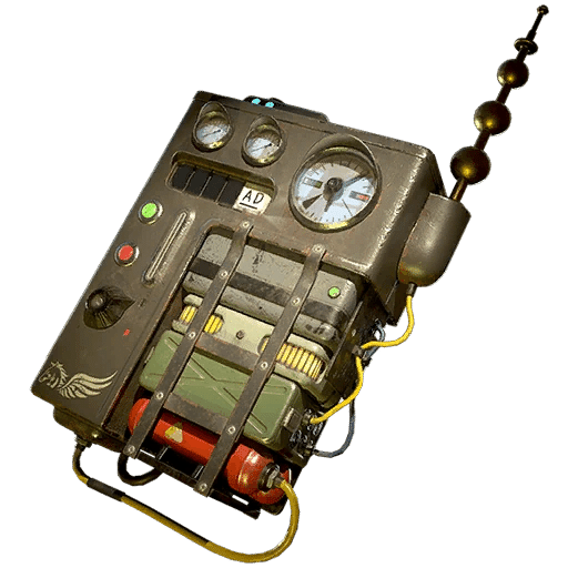 背中にはクロノトロンを装着しており、ベストの襟には骨董品ギルドのピンが留められています。