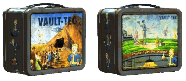一部のランチボックスには、Vault Girlやヌカ・コーラのステッカー、または子供の名前が前面か背面に貼られていることがあります。