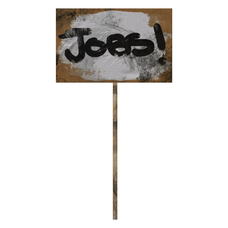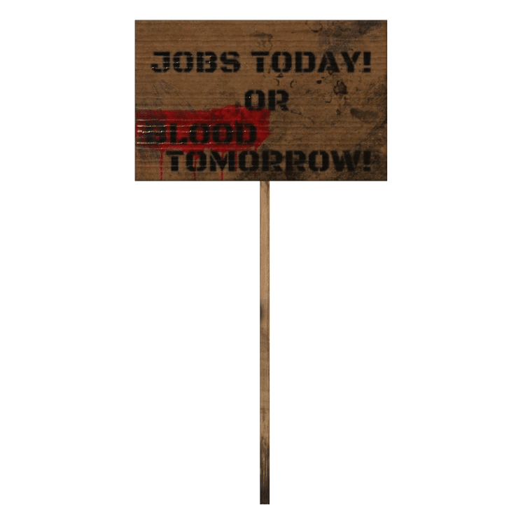 「jobs or blood」の看板が1つ見つかります。ストライキ集会所: