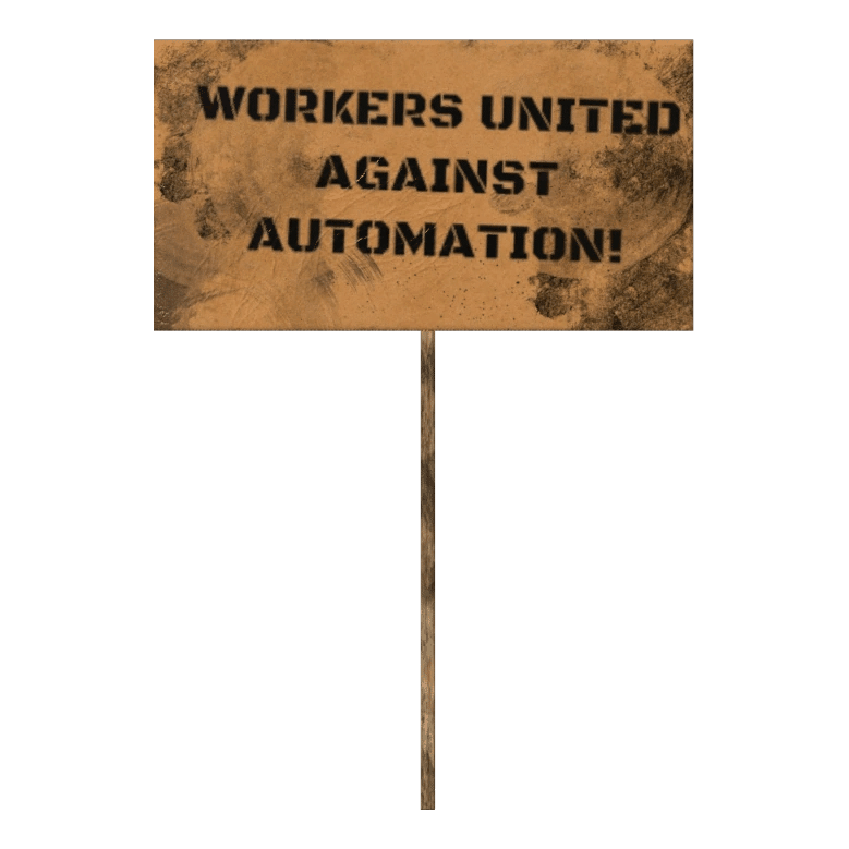 "Workers united against automation!"(労働者はオートメーションに団結して反対する!)