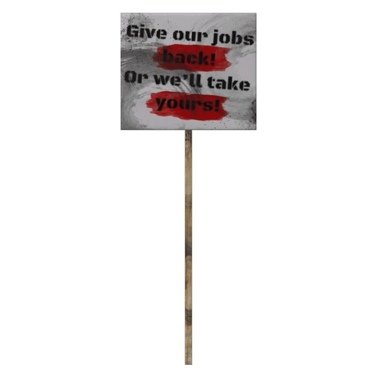 "Give our jobs back! Or we'll take yours!"(仕事を返せ!さもなくばお前の仕事を取るぞ!)
