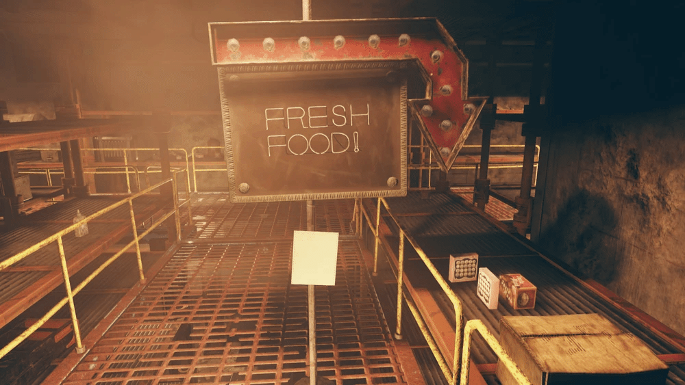 キャッシュの2階、「Fresh Food(新鮮な食料)」の看板を過ぎたところにある2つの木製コンテナの間の木箱の側面にあるメモ。ADD FOOD HERE (ここに食料を追加)