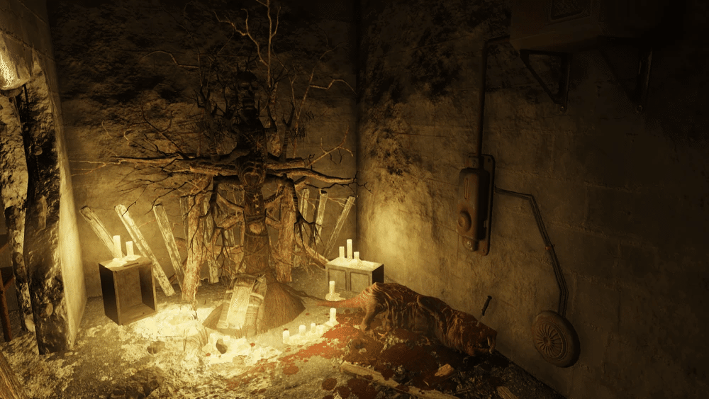地下室: カルト教団の祭壇があり、根や人間の遺体で作られています。生贄にされたモールラットも横たわっています。
